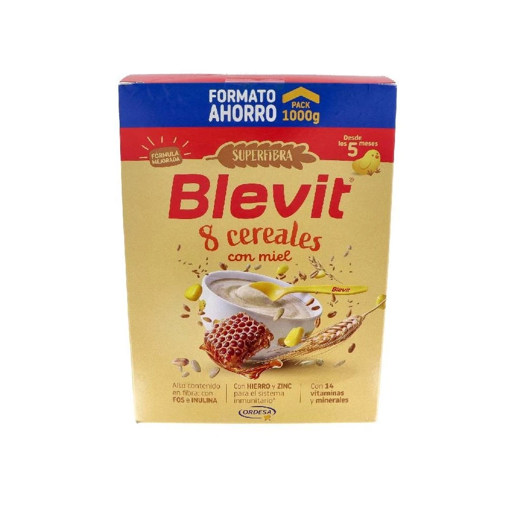 Blevit® SUPERFIBRA 8 cereales con miel cuenta con un 88% de cereales y un 5% de miel, además aporta vitaminas, minerales y un alto contenido en fibra.