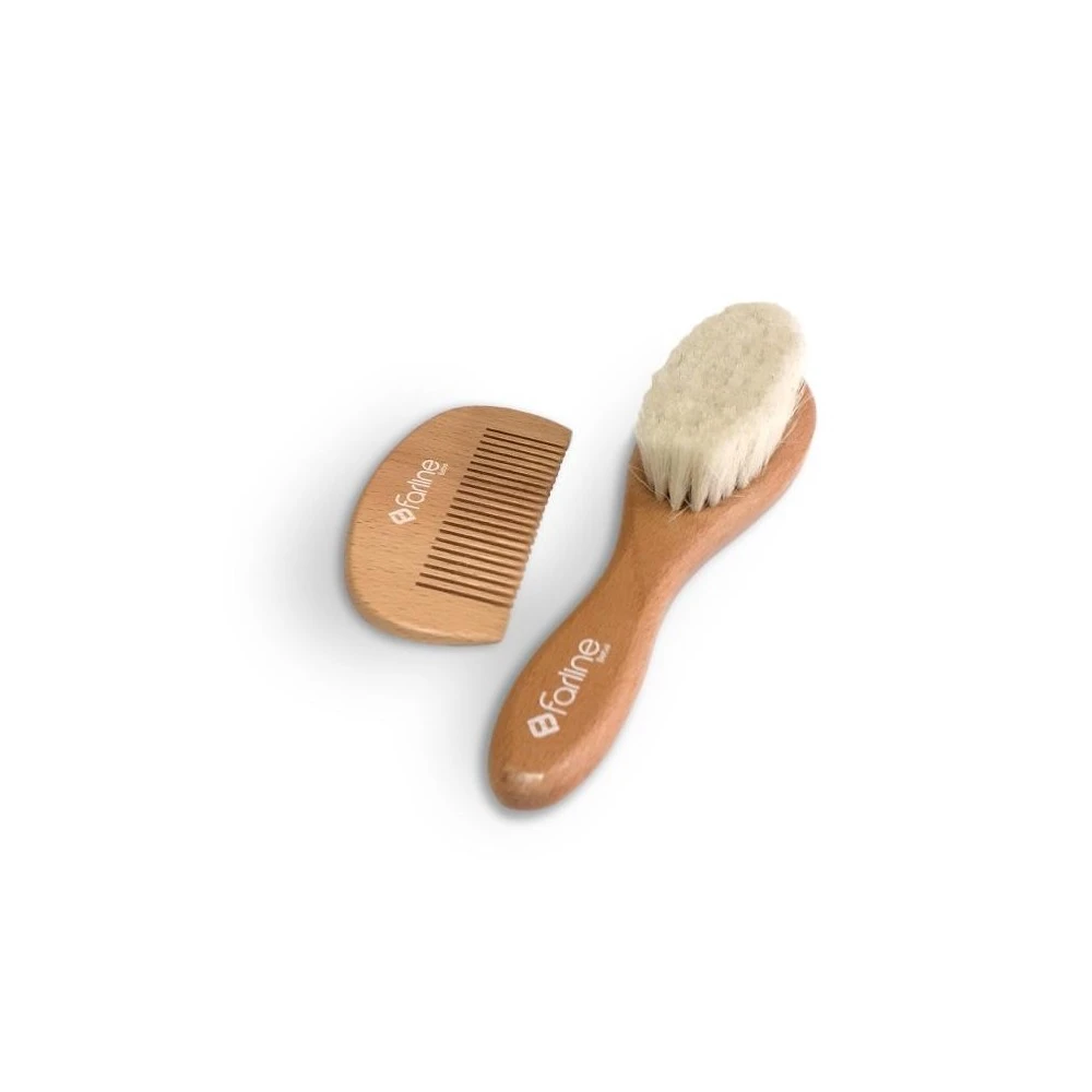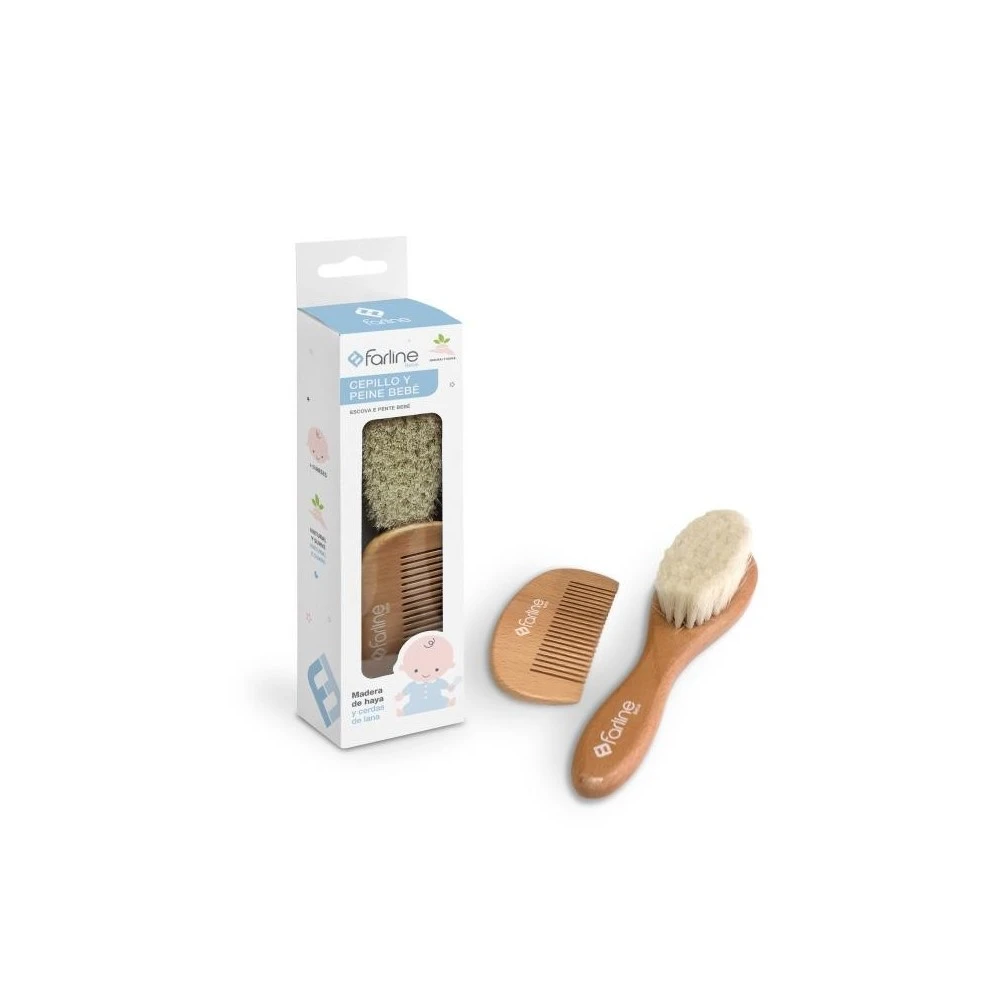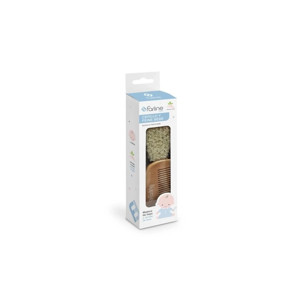 Farline Pack con Peine y Cepillo de Bebé, , fabricados en madera de haya y cerdas de lana para peinar delicadamente el cabello de tu bebé. Ideal para incluirlo en una canastilla de recién nacido.