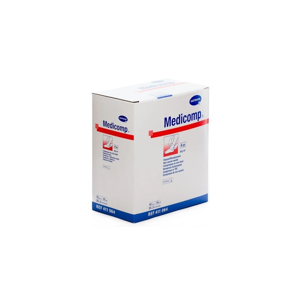 Compresas de tejido sin tejer, fabricadas con un 70% de viscosa y un 30% de poliester; sin agentes blanqueantes ni tensoactivos; altamente absorbentes, suaves y permeables al aire; se pueden cortar sin dejar hilos.