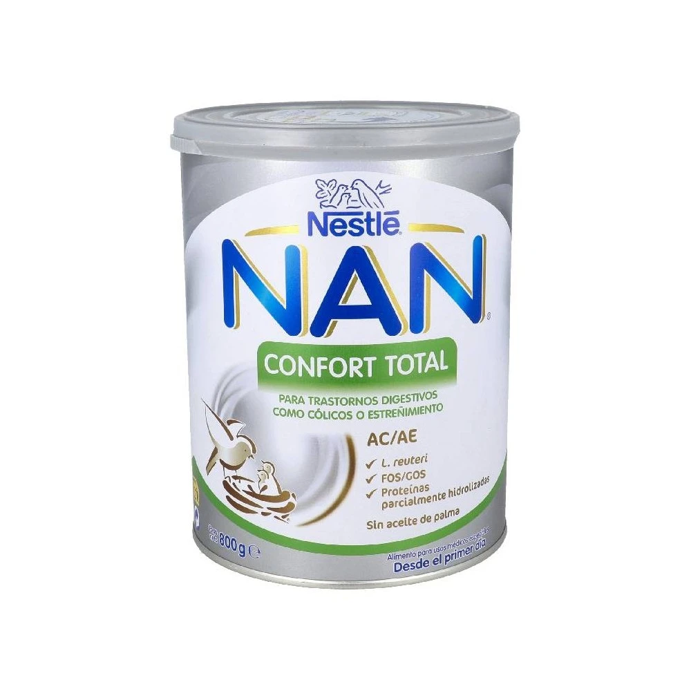 Nan Confort Total es útil para transtornos digestivos como cólicos o estreñimientos. Con L. reuteri, Fos/Gos, proteínas parcialmente hidrolizadas y sin aceite de palma. 800 g.