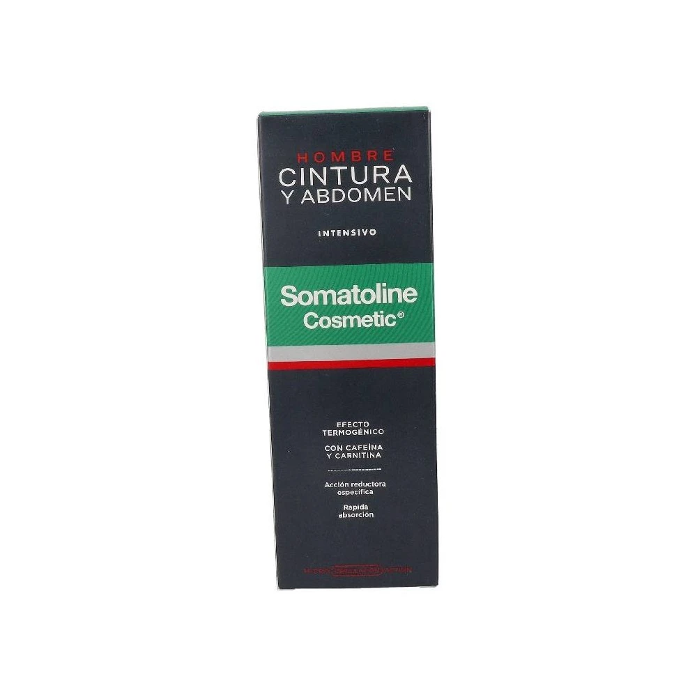 Somatoline Cosmetic Hombre Cintura y Abdomen Intensivo. Contenido: 250 ml. Se trata de una crema de tratamiento intensivo para la zona de la cintura y el abdomen. Debido a su composición, posee una textura muy suave que resulta de fácil y rápida absorción para la piel. Además, no deja residuos grasos en la superficie. Su fórmula tiene un efecto de calor a frío. Resulta muy fácil de usar y estimula la pérdida de grasa ubicada en la zona de la cintura. Su acción facilita la disminución del volumen corporal, aportando un efecto de esculpido, sin necesidad de implicar pérdida de peso. Sus resultados comienzan a observarse a partir de los 10 días de uso continuado.